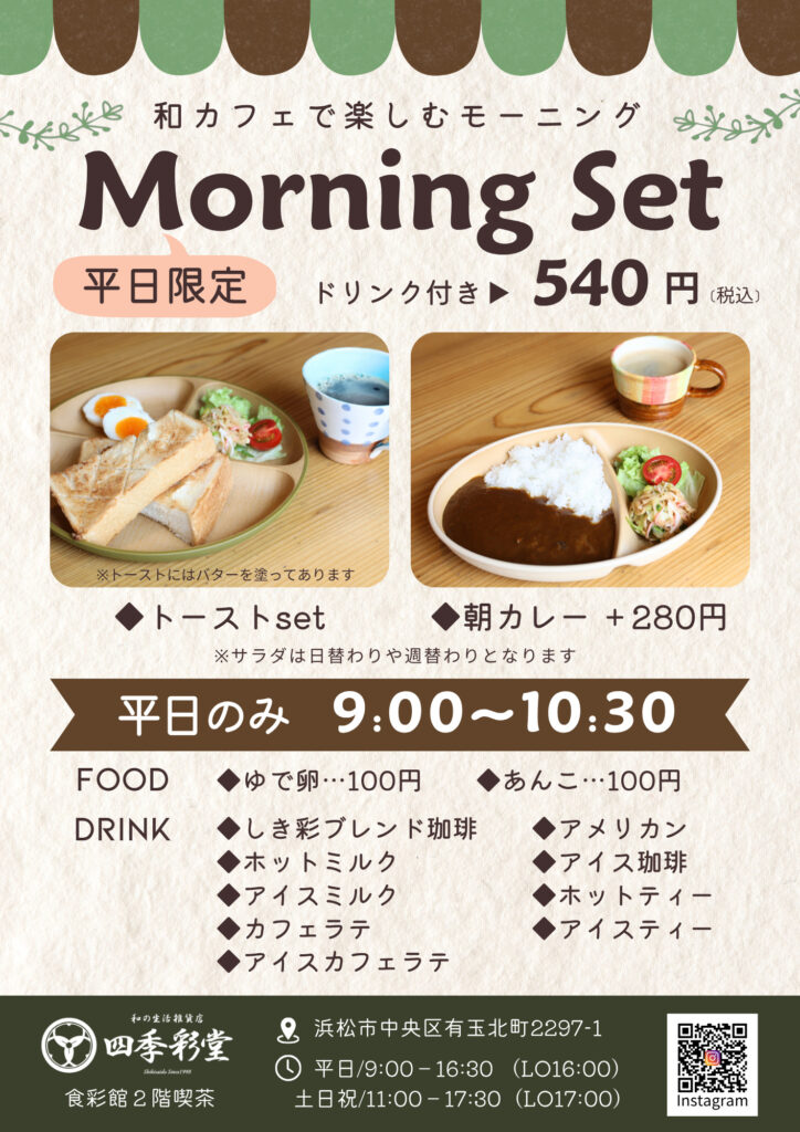 食彩館2階 いっ福茶屋しき彩 4月13日(月)~ 平日限定モーニング始めます
