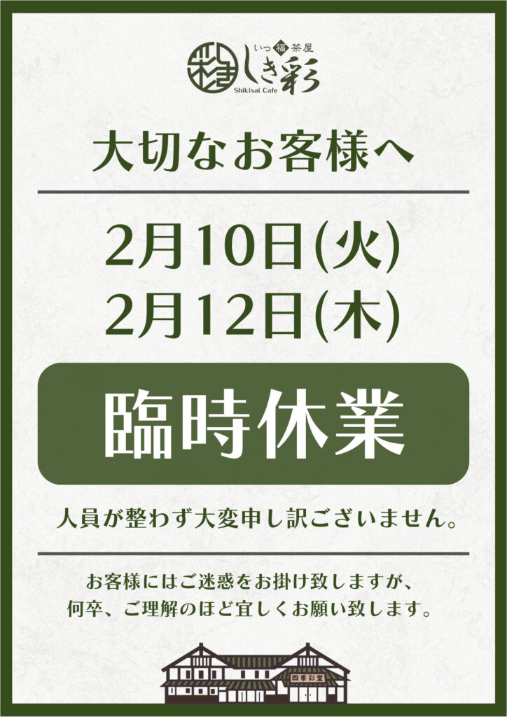 食彩館2階喫茶 2月10日(火)・12日(木) 臨時休業させて頂きます。